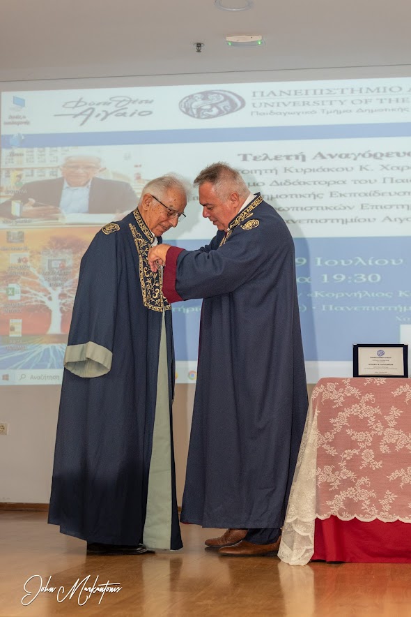 Το πανεπιστήμιο του Αιγαίου, σε ειδική πανηγυρική εκδήλωση που πραγματοποιήθηκε στη Ρόδο στις 19 Ιουλίου 2023, ανακήρυξε τον Κυριάκο Χαραλαμπίδη Επίτιμο Διδάκτορα του Παιδαγωγικού Τμήματος Δημοτικής Εκπαίδευσης της Σχολής Ανθρωπιστικών Επιστημών του Πανεπιστημίου Αιγαίου.