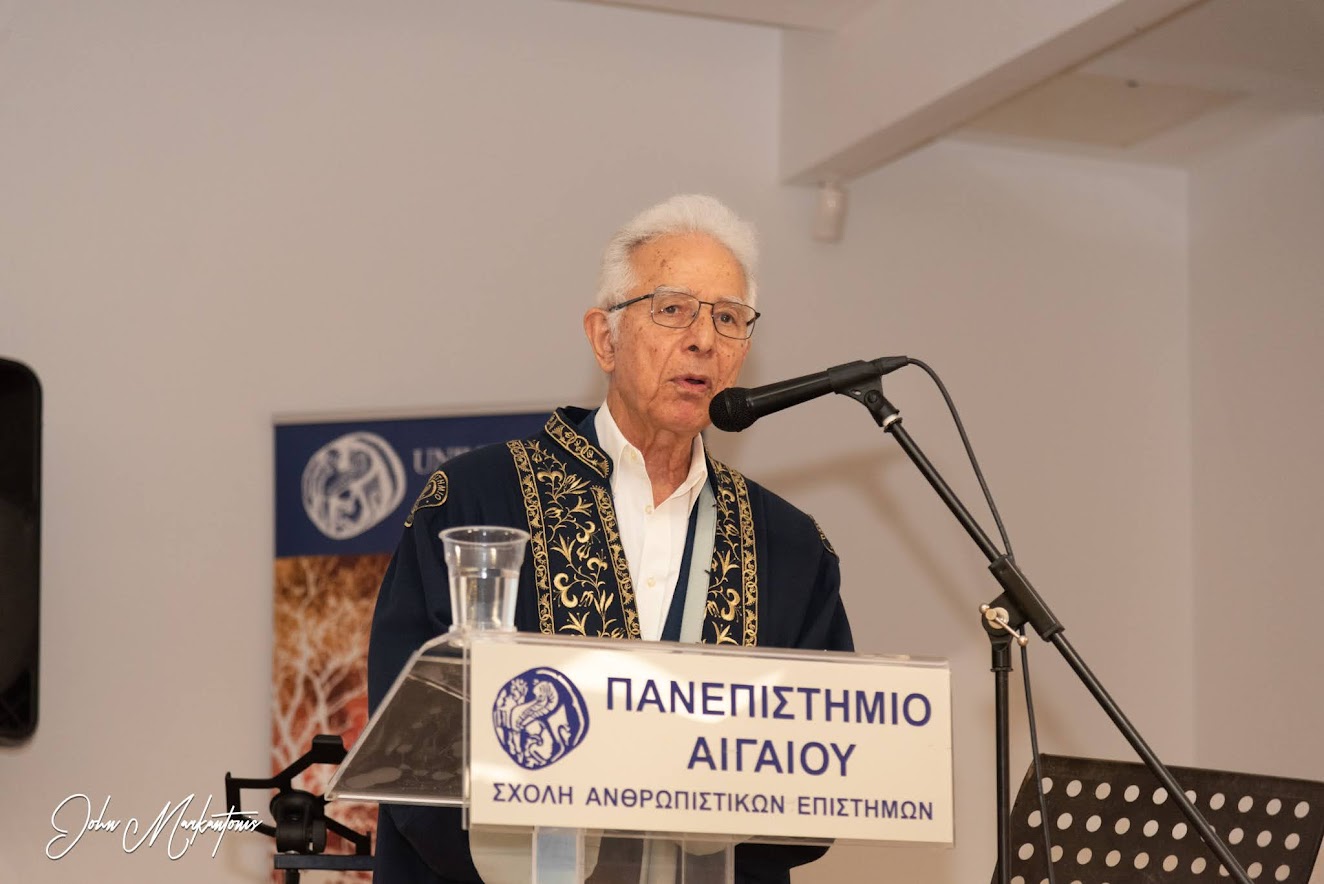 Μετά τους χαιρετισμούς από τον Πρύτανη του Πανεπιστημίου Αιγαίου, Καθηγητή Ανδρέα Ι. Τρούμπη, τον Κοσμήτορα της Σχολής Ανθρωπιστικών Επιστημών, Καθηγητή Ιωάννη Σεϊμένη και τον Πρόεδρο του Παιδαγωγικού Τμήματος Δημοτικής Εκπαίδευσης, Καθηγητή Πολύκαρπο Καραμούζη, η καθηγήτρια του Παιδαγωγικού Τμήματος Δημοτικής Εκπαίδευσης Λουΐζα Χριστοδουλίδου παρουσίασε με λόγο θαυμαστό, περιεκτικό και ιδιαιτέρως επαινετικό την προσωπικότητα και το έργο του τιμωμένου.