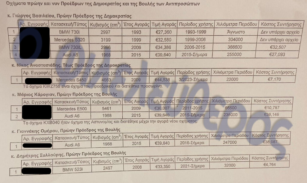 Σε ό,τι αφορά τα ποσά που έχουν δαπανηθεί για αγορά και συντήρηση οχημάτων που χρησιμοποιούν οι εν λόγω πρώην αξιωματούχοι, το συνολικό ποσό ανέρχεται στις 477.695 ευρώ. Θα πρέπει βέβαια να διευκρινιστεί ότι το αυτοκίνητο που χρησιμοποιεί ο Νίκος Αναστασιάδης (€44.538) ανήκει στο Προεδρικό και του διατέθηκε προσωρινά. Το δε πρώτο όχημα που χρησιμοποιούσε ο κ. Καρογιάν (€30.007) ήταν της Αστυνομίας και διατέθηκε μέχρι να αγοράσει νέο αυτοκίνητο.