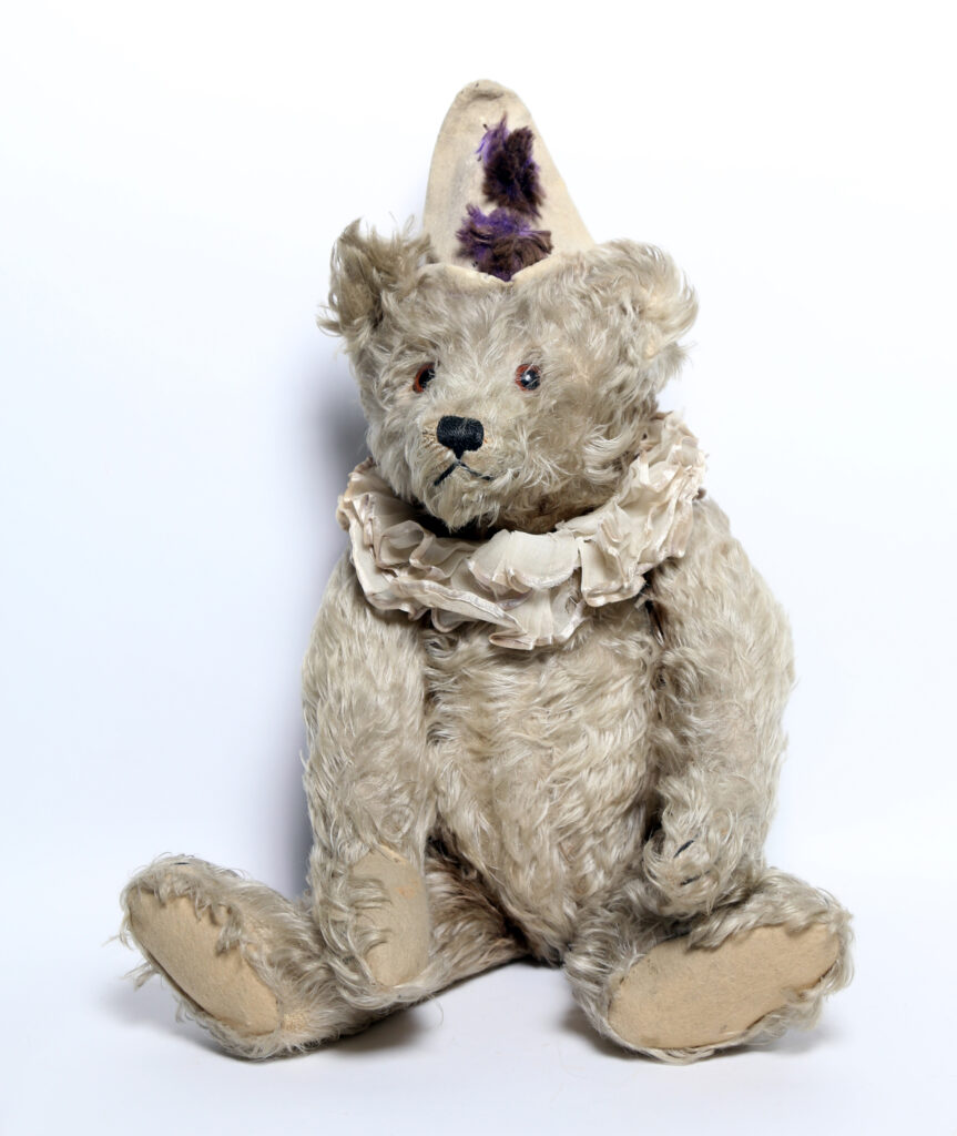Κλόουν – Ένας πολύ σπάνιος κλόουν από σγουρό μοχέρ, ραμμένη μύτη και γυάλινα μάτια της εταιρείας Steiff, με αυθεντικό καπέλο, με μοβ πομ πομ και γιακά-φουρό, κατασκευασμένος στα μέσα της δεκαετίας του 1920