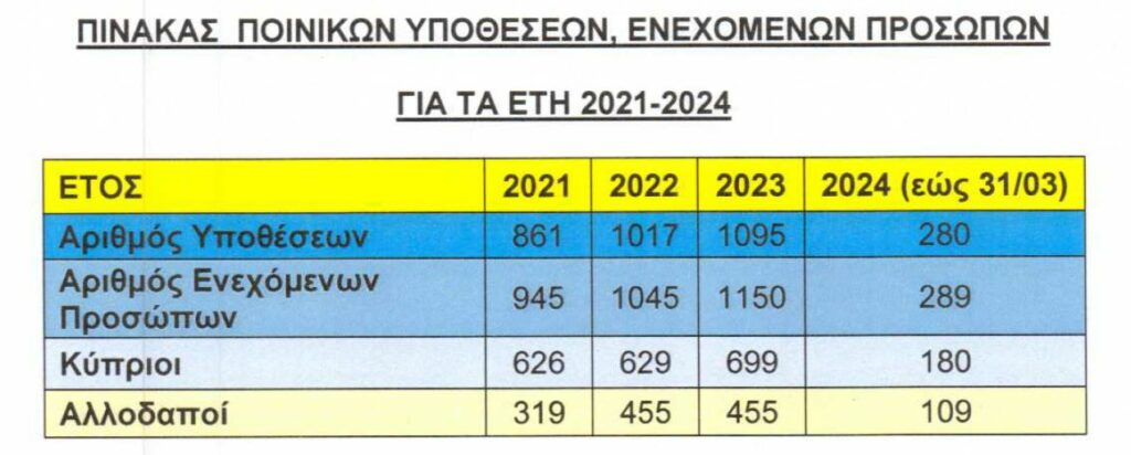 Συγκεκριμένα, από το 2021 έως τον Μάρτιο του 2024 καταγράφονται 3.253 ποινικές υποθέσεις, στο 37,4% των οποίων (δηλαδή στις 1.219) εμπλέκονται ανήλικοι και νέοι.