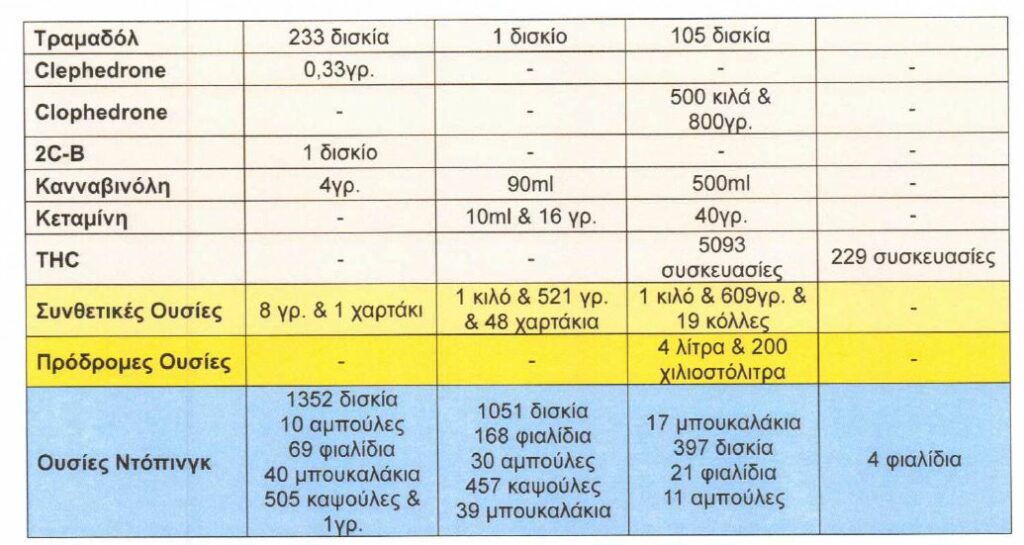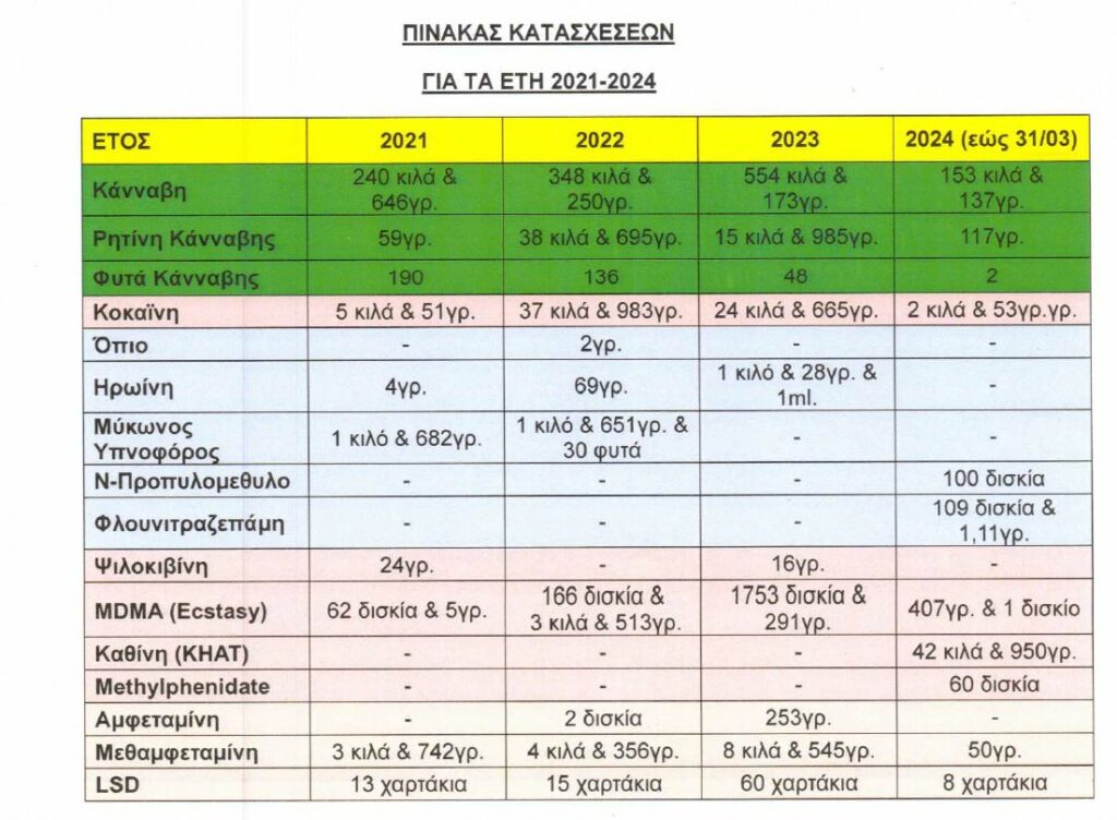 Μεγάλες ποσότητες ναρκωτικών ουσιών κατασχέθηκαν από το 2021 έως το πρώτο τρίμηνο του 2024 από την Αστυνομία. Ειδικά όσον αφορά στην κάνναβη, οι αριθμοί εντυπωσιάζουν αφού ξεπερνούν τα 1.295 κιλά. Μεγάλες οι ποσότητες και της κοκαΐνης, οι οποίες ξεπέρασαν τα 68 κιλά. Επιπλέον, κατασχέθηκαν 1.982 δισκία MDMA (ecstasy) και 2.403 δισκία ουσιών ντόπινγκ, τα οποία όμως κυκλοφορούν και σε άλλες μορφές όπως αμπούλες, φιαλίδια κ.α..