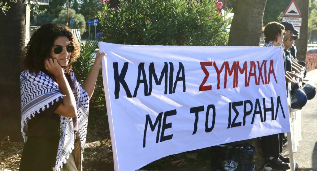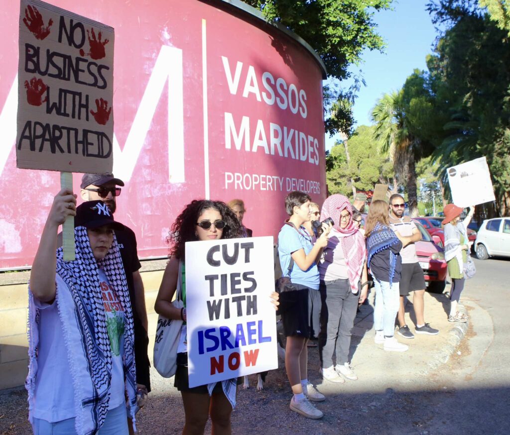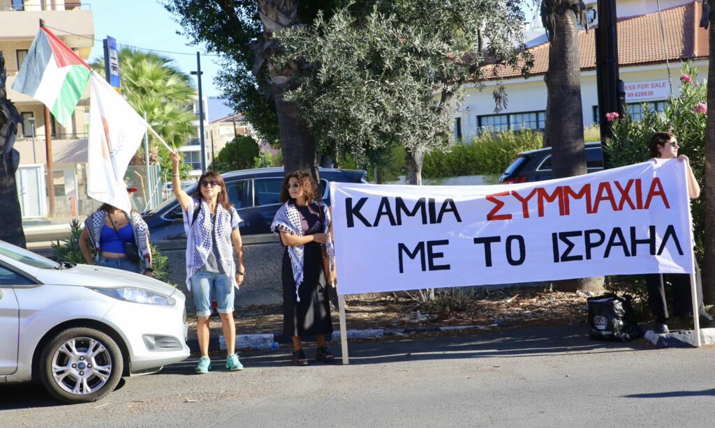 Εκδήλωση διαμαρτυρίας πραγματοποιήθηκε το πρωί της Τετάρτης έξω από τον χώρο όπου διεξάγεται το συνέδριο «Doing Business with Israel», που διοργανώνει το Invest Cyprus, στη Λευκωσία.