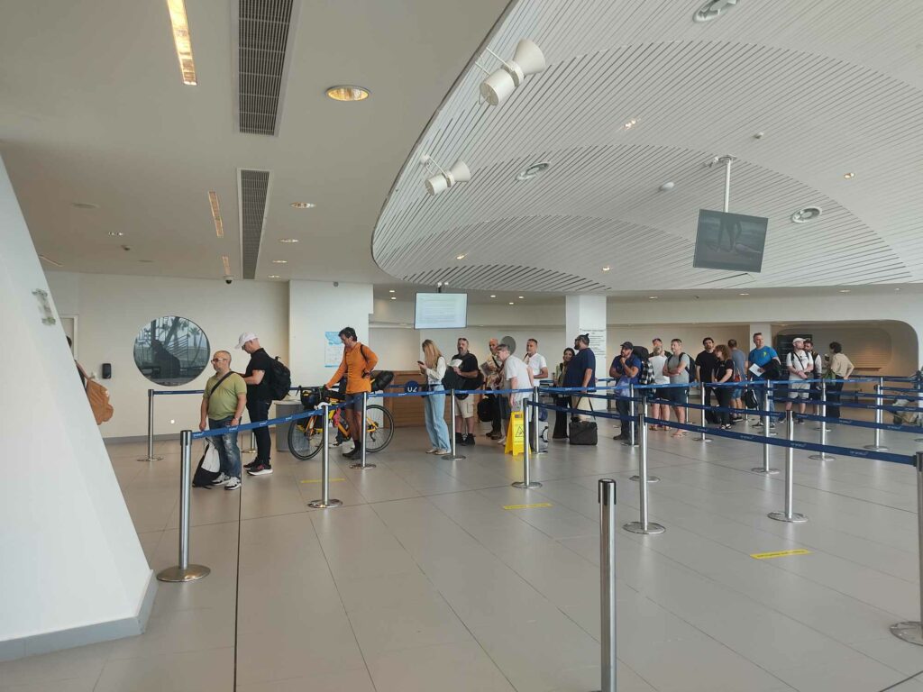 Κατά την είσοδό μας στην αίθουσα αναχωρήσεων, συναντήσαμε επιβάτες που ταξίδευαν προς τον Πειραιά είτε για λόγους αναψυχής είτε με προορισμούς εντός Ελλάδας και Ευρώπης. Μια ομάδα μοτοσικλετιστών μάς δήλωσε με ενθουσιασμό ότι, μετά την άφιξή τους στον Πειραιά, θα συνεχίσουν το ταξίδι τους με μοτοσικλέτες προς την Ιταλία.