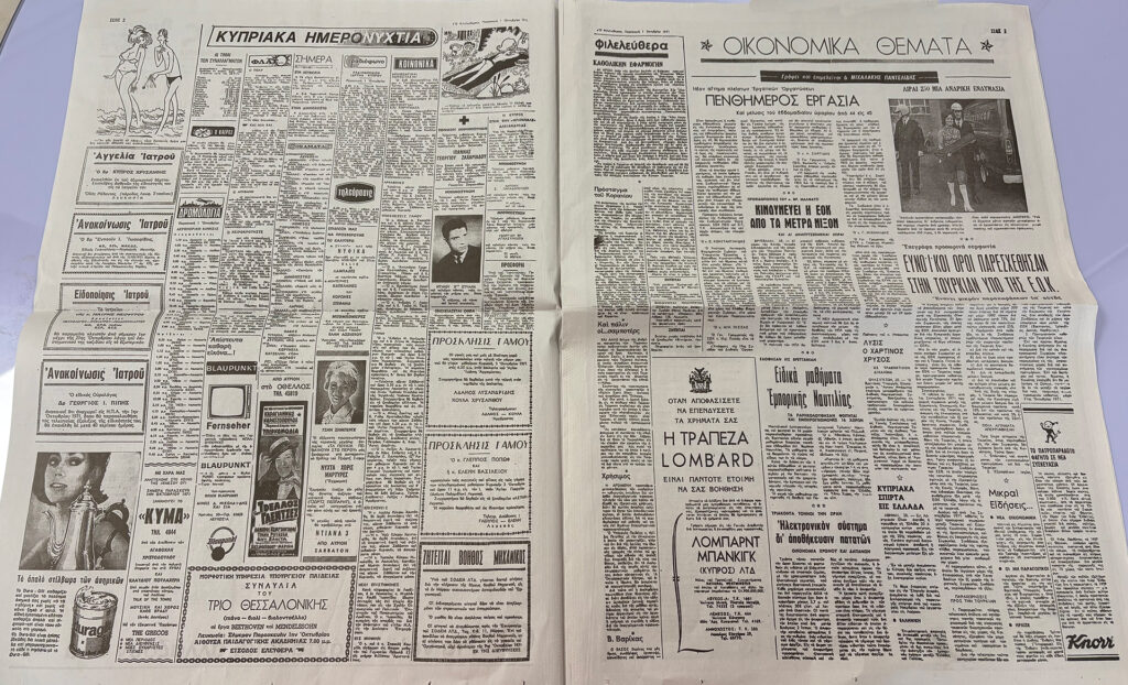 Και δώστε προσοχή στις διαφημίσεις. Είναι κι αυτές μέρος της ιστορίας. Το «Ινστιτούτο Φρειδερίκου», που σήμερα είναι πανεπιστήμιο, αναγγέλλει: «Έναρξις μαθημάτων ΑΓΓΛΙΚΩΝ διά μαθητάς Δημοτικών Σχολείων». Με δωρεάν μεταφορά των μαθητών από τα προάστεια. Ενώ, «υπό του Οίκου ΔΙΚΡΑΝ ΟΥΖΟΥΝΙΑΝ & ΣΙΑ ΛΤΔ, αντιπροσώπου των πασίγνωστων αυτοκινήτων ΤΟΥΟΤΑ, ζητείται πεπειραμένος πωλητής αυτοκινήτων»…
