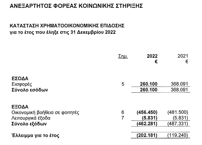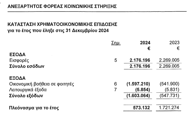 Ιδιαίτερο ενδιαφέρον παρουσιάζουν επίσης τα ποσά των εξόδων για οικονομική βοήθεια προς φοιτητές. Συγκεκριμένα, ενώ τα έσοδα ήταν σε παρόμοια επίπεδα, το 2024 ο «Φορέας» φαίνεται να έβγαλε από τα ταμεία του περίπου 1 εκατ. ευρώ περισσότερο σε σχέση με το 2023, αφού διέθεσε 1.597.210 εκατ. ευρώ το 2024, σε σύγκριση με τις 541.900 ευρώ το 2023. Η μεγάλη διαφορά φαίνεται και στο πλεόνασμα του κάθε έτους, με 573.132 εκατ. ευρώ το 2024 και 1.721.274 εκατ. ευρώ το 2023.