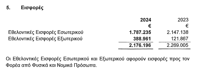 Στις Οικονομικές Καταστάσεις που δημοσιοποιήθηκαν συμπεριλαμβάνονται και τα ποσά που εισέπραξε το ταμείο του «Φορέα» από εσωτερικό και εξωτερικό αντίστοιχα. Σε σχέση με τα έσοδα του 2024 από εισφορές, στην συντρηπτική πλειοψηφία τους προήλθαν από το εσωτερικό. Ειδικότερα, από τα 2,17εκ. ευρώ, περίπου το 1,8εκ. εισπράχθηκε από εθελοντές στην Κύπρο και οι υπόλοιπες σχεδόν 400 χιλιάδες από το εξωτερικό. Αξιοσημείωτη είναι επίσης η μικρή αύξηση στο ποσό των εισφορών από το εξωτερικό σε σχέση με το 2023, όταν είχαν φτάσει τις 121 χιλιάδες ευρώ.