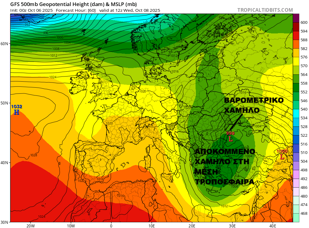 Την Τετάρτη, το αποκομμένο χαμηλό στη μέση τροπόσφαιρα θα αρχίσει να εισέρχεται και πάλι πίσω στη κυκλοφορία της ατμόσφαιρας καθώς κινείται ανατολικότερα προς την περιοχή μας ενώ το βαρομετρικό χαμηλό με κέντρο τη Μαύρη Θάλασσα θα επεκτείνεται μέχρι και την ανατολική Μεσόγειο.