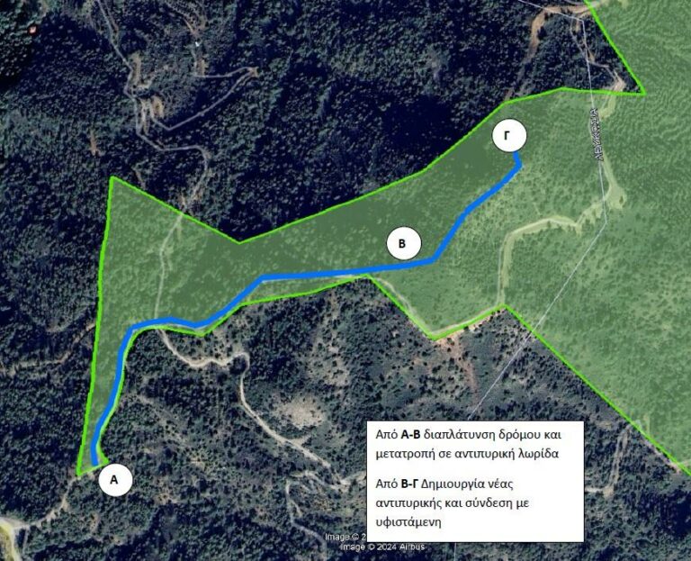 Η κατασκευή περιλαμβάνει: α) Διαπλάτυνση υφιστάμενου δασικού δρόμου μήκους 600 μέτρων, από 6 σε 10 μέτρα β) Διάνοιξη νέας αντιπυρικής λωρίδας μήκους 300 μέτρων και πλάτους 10 μέτρων.