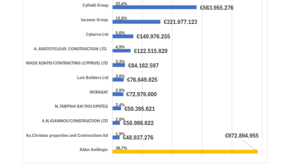 Συνολικά, η Cyfield την περίοδο 2015-2024 ανέλαβε 157 έργα αξίας €563.955.27, οι Αδελφοί Ιακώβου ανέλαβαν 84 έργα αξίας €321.977.123 ενώ η Cybarco Ltd ανέλαβε 40 έργα αξίας €140.976.255.