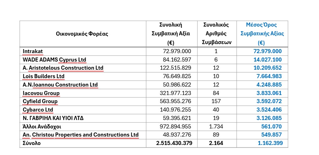 «Συγκεκριμένα, τρεις εργολάβοι (Cyfield, Iacovou και Cybarco), παρόλο που μαζί ανέλαβαν μόνο το 13% του αριθμού των συμβάσεων, εξασφάλισαν το 40,8% της συνολικής αξίας της αγοράς. Το εν λόγω στατιστικό υποδεικνύει αυξανόμενη συγκέντρωση της αγοράς για μεγάλα έργα σε συγκεκριμένους εργολάβους».