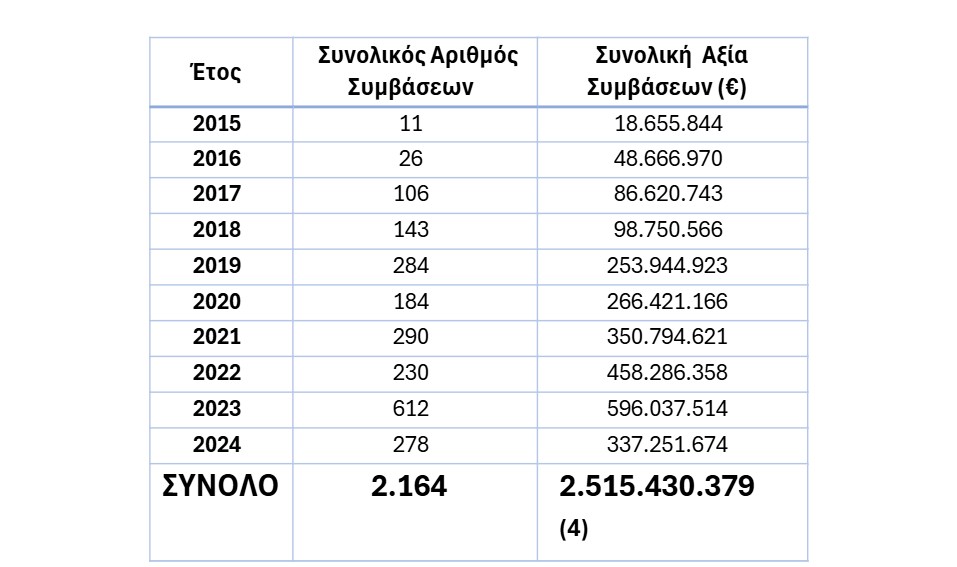 Σημειώνεται, πως τα περισσότερα έργα (612) με τη μεγαλύτερη αξία (596.037.514) ανατέθηκαν το έτος 2023.