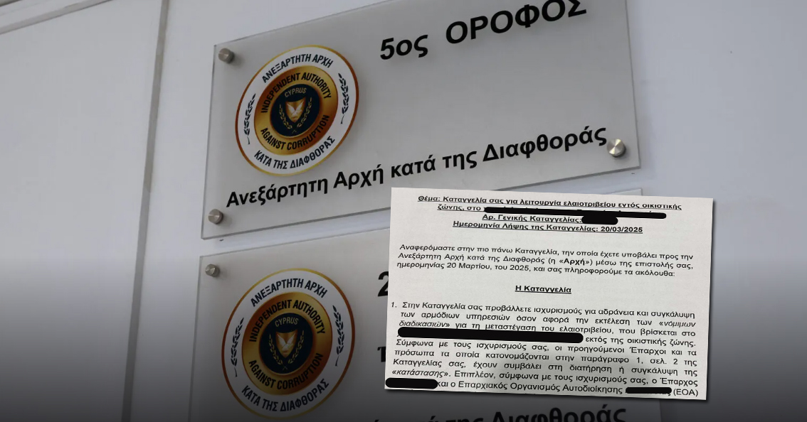 Η Ανεξάρτητη Αρχή κατά της Διαφθοράς στην επιστολή της που εξασφάλισε ο «Φ», συνοψίζει τα βασικά στοιχεία της καταγγελίας: «Στην Καταγγελία σας προβάλλετε ισχυρισμούς για αδράνεια και συγκάλυψη των αρμόδιων υπηρεσιών όσον αφορά την εκτέλεση των «νόμιμων διαδικασιών» για τη μετεγκατάσταση του ελαιοτριβείου, που βρίσκεται στο χωριό …, της Επαρχίας …, εκτός της οικιστικής ζώνης. Σύμφωνα με τους ισχυρισμούς σας, οι προηγούμενοι Έπαρχοι και τα πρόσωπα τα οποία κατονομάζονται στην παράγραφο 1, σελ. 2 της Καταγγελίας σας, έχουν συμβάλει στη διατήρηση ή συγκάλυψη της «κατάστασης». Επιπλέον, σύμφωνα με τους ισχυρισμούς σας, ο Έπαρχος … και ο Επαρχιακός Οργανισμός Αυτοδιοίκησης … (ΕΟΑ) αρνούνται να επιδώσουν το Διάταγμα του Επαρχιακού Δικαστηρίου … , ημερ. 22/3/2023, στην ποινική υπόθεση υπ’ αρ. …. Συμπερασματικά, ισχυρίζεστε ότι «είναι προφανές ότι κάποιος υπουργός ή αρχηγός κόμματος εμπλέκεται και καλύπτει τον ιδιοκτήτη του ελαιοτριβείου».
