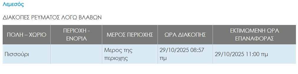 Επίσης, πρόβλημα σημειώνεται και στο Πισσούρι όπου το ρεύμα αναμένεται να επανέλθει στις 11:00.