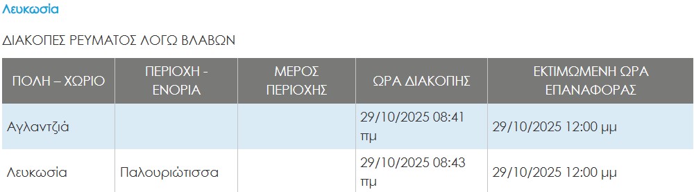 Σύμφωνα με την επίσημη σελίδα της ΑΗΚ, αυτή την ώρα χωρίς ρεύμα λόγω βλαβών είναι η Αγλαντζιά και η Παλουριώτισσα. Τα προβλήματα εκτιμάται ότι θα αποκατασταθούν στις 12:00 το μεσημέρι.