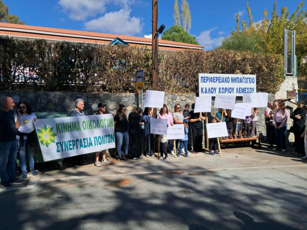 Έξω από το Περιφερειακό Νηπιαγωγείο Καλού Χωριού, για δύο ώρες, μικρά παιδιά, γονείς και κάτοικοι, μαζί με μέλη της Επαρχιακής Επιτροπής Λεμεσού του Κινήματος Οικολόγων – Συνεργασία Πολιτών, διαμαρτυρήθηκαν για την αδικαιολόγητη αδράνεια των αρμόδιων αρχών. Το νηπιαγωγείο παραμένει για τρίτη συνεχή χρονιά κλειστό, χωρίς ενημέρωση, χωρίς χρονοδιάγραμμα και, όπως λένε οι γονείς, χωρίς σεβασμό στα παιδιά τους.