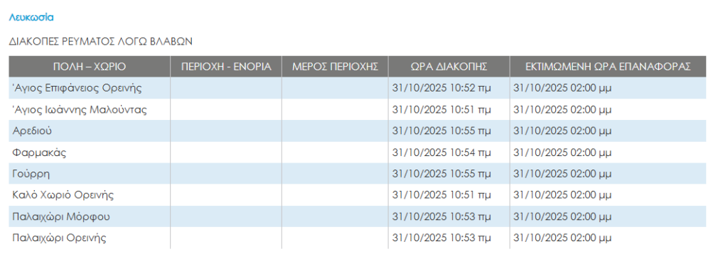 Σύμφωνα με όσα καταγράφονται από την ΑΗΚ, η ηλεκτροδότηση διακόπηκε γύρω στις 10:50πμ και η εκτιμώμενη ώρα επαναφοράς είναι στις 02:00μμ.
