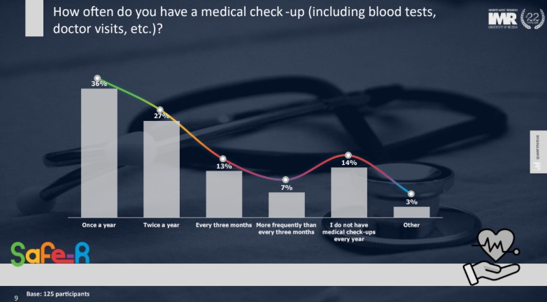 Περίπου ένας στους τρεις (36%) από τους συμμετέχοντες ανέφεραν ότι υποβάλλεται σε ιατρικό έλεγχο μία φορά τον χρόνο. Το 27% απάντησε δύο φορές τον χρόνο, το 13% πραγματοποιεί συχνότερες επισκέψεις. Ωστόσο, το 14% δεν υποβάλλεται καν σε ετήσιο έλεγχο.