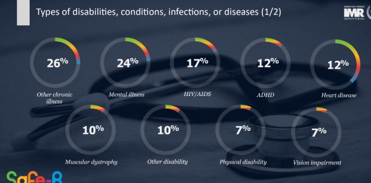 Τα πιο συχνά αναφερόμενα ζητήματα ήταν ψυχικές παθήσεις (24%), HIV/AIDS (17%), καρδιακές παθήσεις (12%), μυϊκή δυστροφία (10%), κινητικές ή οπτικές βλάβες (7%) και σωματική αναπηρία (7%). Το 26% απάντησε πως αντιμετωπίζει άλλες χρόνιες παθήσεις.