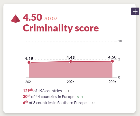Στο δια ταύτα, η Κύπρος για το 2025 καταγράφει σκορ 4,5/10 και παραμένει στην 129η βαθμίδα της κατάταξης από σύνολο 193 χωρών που αξιολογούνται. Όσο πιο χαμηλή θέση στην κατάταξη εγκληματικότητας έχει ένα κράτος, τόσο καλύτερα είναι τα δεδομένα. Είναι ενδεικτικό ότι στις πρώτες τρεις θέσεις βρίσκονται η Μιανμάρ (8.08/10), το Μεξικό (7.82/10) και η Κολομβία (7.68), χώρες, οι οποίες είναι γνωστές για τον υψηλό δείκτη εγκληματικότητάς τους.