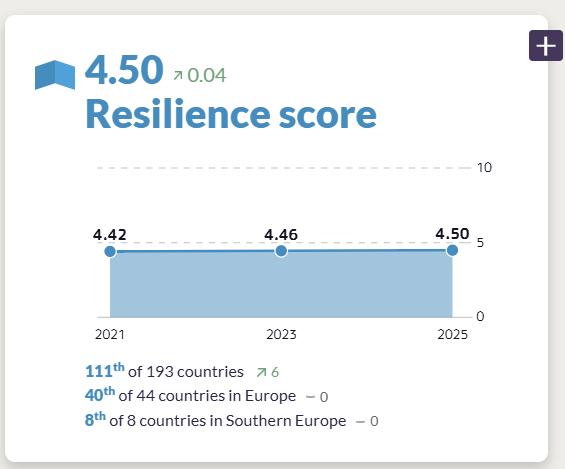 Σε ό,τι αφορά τον δείκτη «ανθεκτικότητας» που προσμετρά την ικανότητα μιας χώρας να αντιμετωπίσει και να αποκαταστήσει τις συνέπειες της οργανωμένης εγκληματικότητας, τα νέα για το νησί μας είναι ελαφρώς καλύτερα εν σχέσει με την προηγούμενη διετία. Με σκορ 4.5/10 (από 4.46/10 το 2023) έχει ανέβει έξι σκαλοπάτια στην κατάταξη σε σχέση με τις επιδόσεις της το 2023 και πλέον είναι 111η.