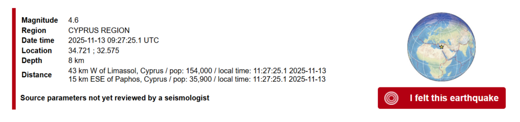 Νέος ισχυρός σεισμός, σημειώθηκε στις 11:27. Σύμφωνα με τα πρώτα στοιχεία, ο σεισμός σημειώθηκε 10 χιλιόμετρα ανατολικά της Πάφου, με τις πρώτες ενδείξεις να κάνουν λόγο για 4,3 Ρίχτερ.