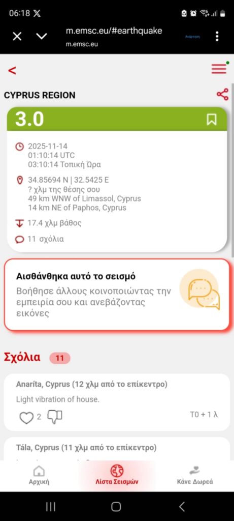 Το επίκεντρο του σεισμού καταγράφεται 14 χιλιόμετρα από την Πάφο και 49 από τη Λεμεσό, ενώ το εστιακό του βάθος ήταν στα 17 χιλιόμετρα.