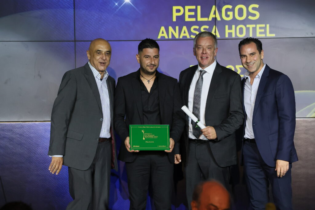 Ο ακαδημαϊκός και εικαστικός Σάββας Χριστοδουλίδης βραβεύει το εστιατόριο Pelagos στην κατηγορία Κυπριακή Κουζίνα. Το βραβείο παρέλαβαν οι David Goodridge, Orlando Καδής και Χριστόδουλος Παναγιωτίδης.