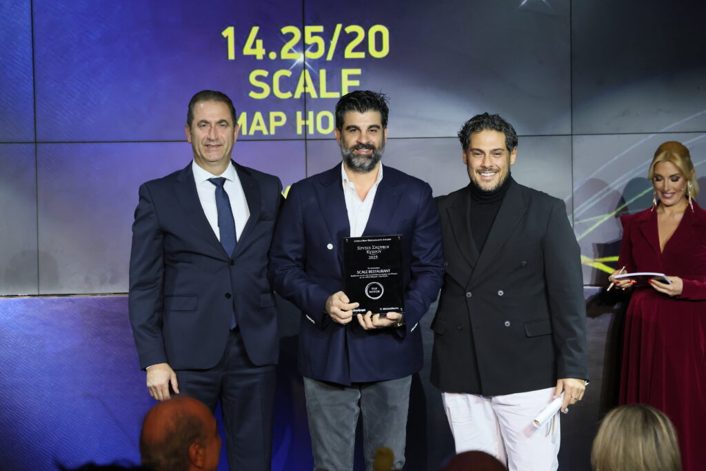 Ο κοινοβουλευτικός εκπρόσωπος του ΑΚΕΛ, Γιώργος Λουκαΐδης, βραβεύει το εστιατόριο Scale στην κατηγορία Top Notch. Το βραβείο παρέλαβαν οι Αθηναγόρας Κωστάκος και Μάριος Πολυκάρπου.