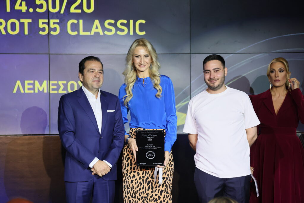 Ο διευθύνων σύμβουλος της D. Zavos Group, Μιχαλάκης Ζαβός, βραβεύει το εστιατόριο Bistrot 55 Classic στην κατηγορία Top Notch. Το βραβείο παρέλαβαν οι Ιάκωβος Γιαννακού και Μαρία Αλεξάνδρου.