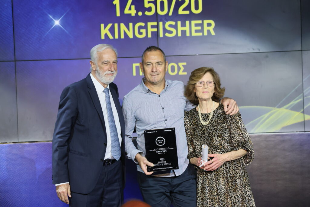 Ο εκτελεστικός διευθύνων σύμβουλος της Petrolina, Ντίνος Λευκαρίτης, βραβεύει το εστιατόριο Kingfisher στην κατηγορία Top Notch. Το βραβείο παρέλαβαν οι Λευτέρης Σαπαρίλλας και Ελένη Σαπαρίλλα.