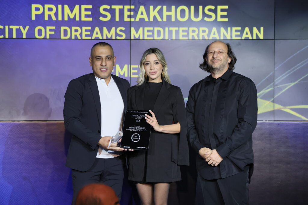 Ο βραβευμένος αρχιτέκτονας Ηρακλής Παπαχρίστου βραβεύει το εστιατόριο Prime Steakhouse στην κατηγορία Top Notch. Το βραβείο παρέλαβαν οι Mohamad Khalil Fahed Al-Saies Και η Κατερίνα Λανού.