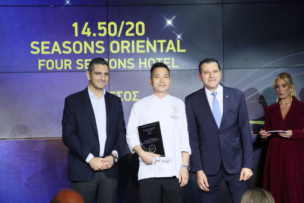 O Βάσος Ηλιάδης, General Manager της Vassos Eliades, βραβεύει το εστιατόριο Seasons Oriental στην κατηγορία Top Notch. Το βραβείο παρέλαβαν οι Guan Ruijong και Κώστας Νικολάου.