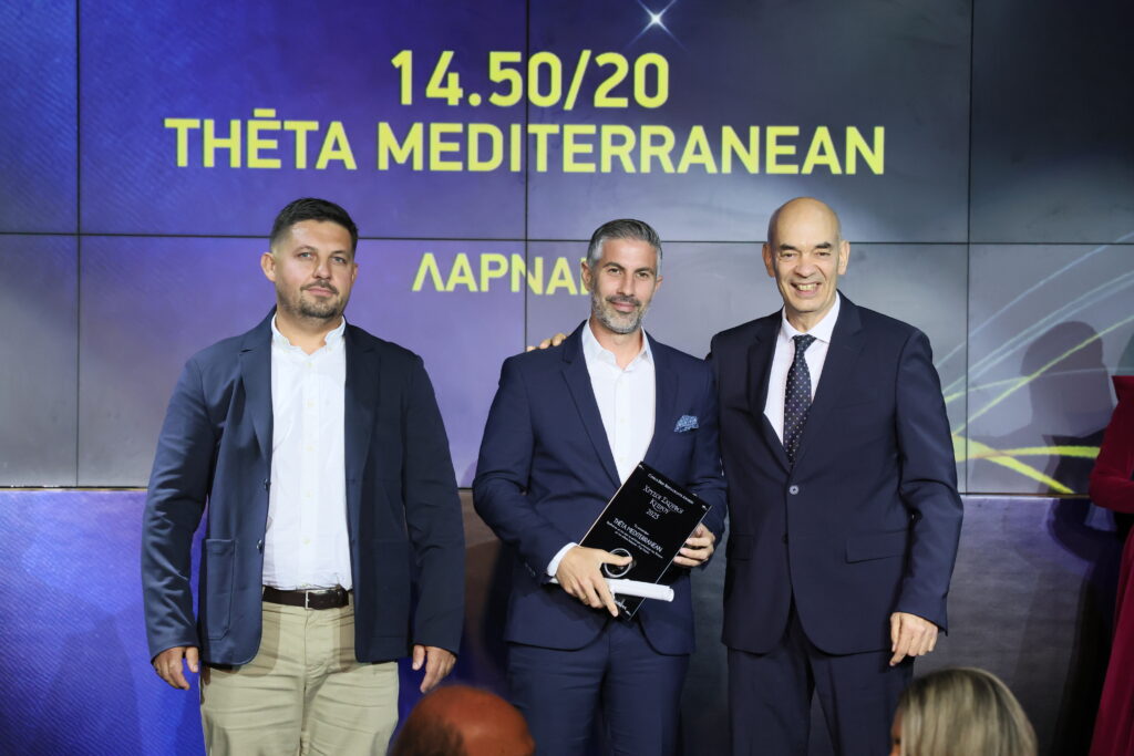 Ο πρόεδρος και διευθύνων σύμβουλος (CEO) του Ευρωπαϊκού Πανεπιστημίου Κύπρου, Χριστόφορος Χατζηκυπριανού, βραβεύει το εστιατόριο Oris στην κατηγορία Top Notch. Το βραβείο παρέλαβαν οι Αθηναγόρας Κωστάκος, Ανδρέας Ρήνας και Μιχάλης Χατζηπαναγιώτου.