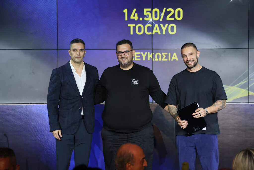 Ο πρόεδρος του Επαρχιακού Οργανισμού Αυτοδιοίκησης Λευκωσίας, Κωνσταντίνος Γιωρκάτζης, βραβεύει το εστιατόριο Kuzuba στην κατηγορία Top Notch. To βραβείο παρέλαβαν οι Γιάννης Προβιδάκης και Γιώργος Μούντης.