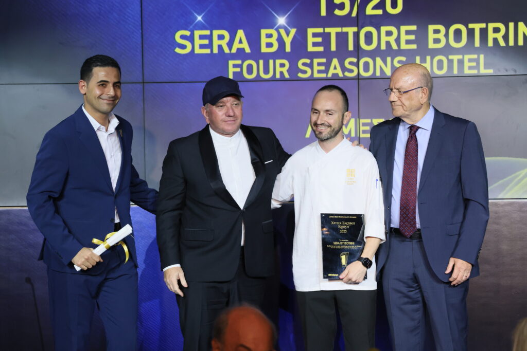 Ο υπουργός Οικονομικών, Μάκης Κεραυνός, βραβεύει με το εστιατόριο Sera by Ettore Botrini με Χρυσό Σκούφο. Το βραβείο παρέλαβαν οι Έκτορας Μποτρίνι και Γιάννης Σωκράτους.