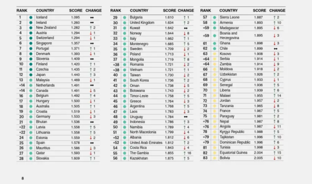 Στον αντίποδα, στην τελευταία θέση είναι η Ρωσία, κάτω και από Ουκρανία, Σουδάν, Κονγκό, Υεμένη και Αφγανιστάν.