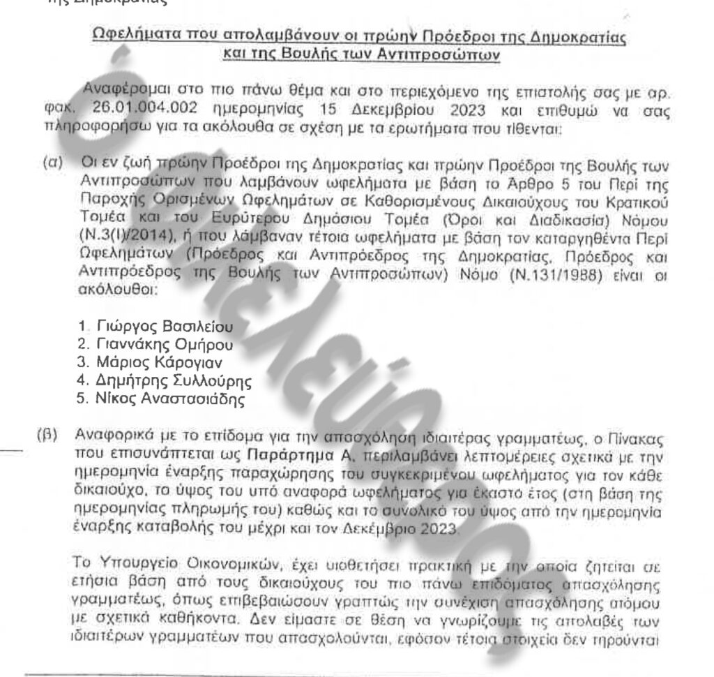 Όλοι οι πρώην ανώτατοι αξιωματούχοι, δηλαδή οι Γιώργος Βασιλείου, Γιαννάκης Ομήρου, Μάριος Κάρογιαν, Δημήτρης Συλλούρης και Νίκος Αναστασιάδης, εντός της τελευταίας 20ετίας και από τον καιρό της αποχώρησής τους από το αξίωμα που κατείχαν έχουν λάβει συνολικά 1.458.744 ευρώ ως επίδομα ιδιαιτέρας γραμματέας, σύμφωνα με επιστολή του Υπουργείου Οικονομικών που είχε συνταχθεί τον Ιανουάριο του 2024.