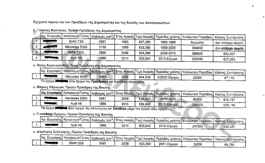Το δε συνολικό ποσό που έχει δαπανηθεί για αγορά και συντήρηση οχημάτων που χρησιμοποιούν οι εν λόγω πρώην αξιωματούχοι, ανέρχεται στις 477.695 ευρώ. Θα πρέπει βέβαια να διευκρινιστεί ότι το αυτοκίνητο που χρησιμοποιεί ο Νίκος Αναστασιάδης (€44.538) ανήκει στο Προεδρικό και του διατέθηκε προσωρινά. Το δε πρώτο όχημα που χρησιμοποιούσε ο κ. Καρογιάν (€30.007) ήταν της Αστυνομίας και διατέθηκε μέχρι να αγοράσει νέο αυτοκίνητο.