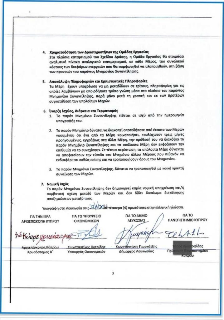 «Το Υπουργείο Οικονομικών της Κυπριακής Δημοκρατίας (εφεξής αποκαλούμενο το «Υπουργείο»), για σκοπούς του παρόντος Μνημονίου εκπροσωπούμενο από τον Υπουργό Οικονομικών, ο Δήμος Λευκωσίας, για σκοπούς του παρόντος Μνημονίου εκπροσωπούμενος από τον Δήμαρχο Λευκωσίας, το Πανεπιστήμιο Κύπρου, για σκοπούς του παρόντος Μνημονίου εκπροσωπούμενο από τον Πρύτανη του Πανεπιστημίου Κύπρου, και η Ιερά Αρχιεπισκοπή Κύπρου, για σκοπούς του παρόντος Μνημονίου εκπροσωπούμενη από τον Αρχιεπίσκοπο Κύπρου (εφεξής καλούμενα «τα Μέρη»):