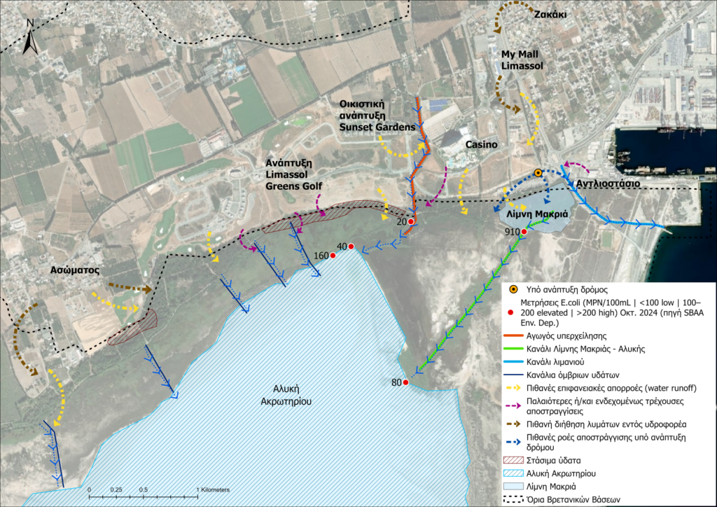 Η εικόνα, προστίθεται, επιβαρύνεται από μετρήσεις ποιότητας νερού που δείχνουν «αυξημένες συγκεντρώσεις του βακτηρίου E. coli σε ορισμένα σημεία της περιοχής όπου έγιναν δειγματοληψίες από τις Βρετανικές Βάσεις, ενώ η έντονη δυσοσμία και η παρουσία αμφίβολης ποιότητας στάσιμων νερών εγείρουν εύλογα ερωτήματα για πιθανές εισροές ρυπασμένων νερών. Η κατάσταση δεν αφορά μόνο τα οικοσυστήματα αλλά και τη δημόσια υγεία».