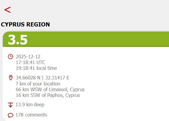 Τριπλή σεισμική δόνηση σημειώθηκε το βράδυ της Παρασκευής (12/12), στην Πάφο.