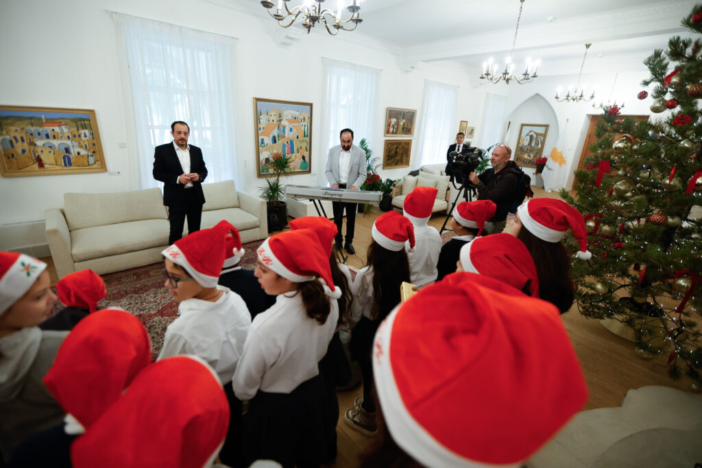 Μαθητές από το Ειδικό Σχολείο Ευαγγελισμός, το Α’ Δημοτικό Σχολείο Μακεδονίτισσας και το Δ’ Δημόσιο Νηπιαγωγείο Αγλαντζιάς επισκέφθηκαν επίσης το Προεδρικό Μέγαρο, για να ερμηνεύσουν χριστουγεννιάτικα τραγούδια ενώπιον του Προέδρου Χριστοδουλίδη, ο οποίος συνομίλησε και αντάλλαξε ευχές με τα παιδιά.