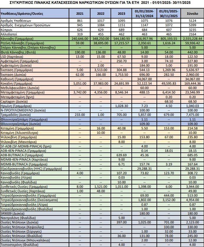 Σημειώνεται ότι σύμφωνα με τα στοιχεία της ΥΚΑΝ, το 2021 κατασχέθηκαν 240 κιλά κάνναβης, το 2022, 348, το 2023, 544 κιλά κάνναβης, το 2024, 617 κιλά και φέτος, 805 κιλά κάνναβης. Όσον αφορά στην κοκαΐνη, το 2023 κατασχέθηκαν 24 κιλά και 691γρ., το 2024, 54 κιλά και 122γρ. και φέτος, 20 κιλά και 651γρ. Για την έκστασι, το ’23 εντοπίστηκαν και κατασχέθηκαν 1.753 δισκία, το ’24 άλλα 696 και φέτος 23 δισκία. Για την ουσία THC ή τετραϋδροκανναβινόλη, τα στοιχεία δείχνουν ότι το ’23 εντοπίστηκαν 5.093 συσκευασίες, το ’24 1.802 και το ’25 άλλες 2.034 συσκευασίες.