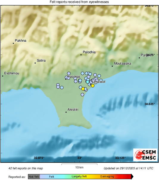 Σεισμική δόνηση σημειώθηκε στη Λεμεσός το απόγευμα της Δευτέρας, στις 16:09 τοπική ώρα.