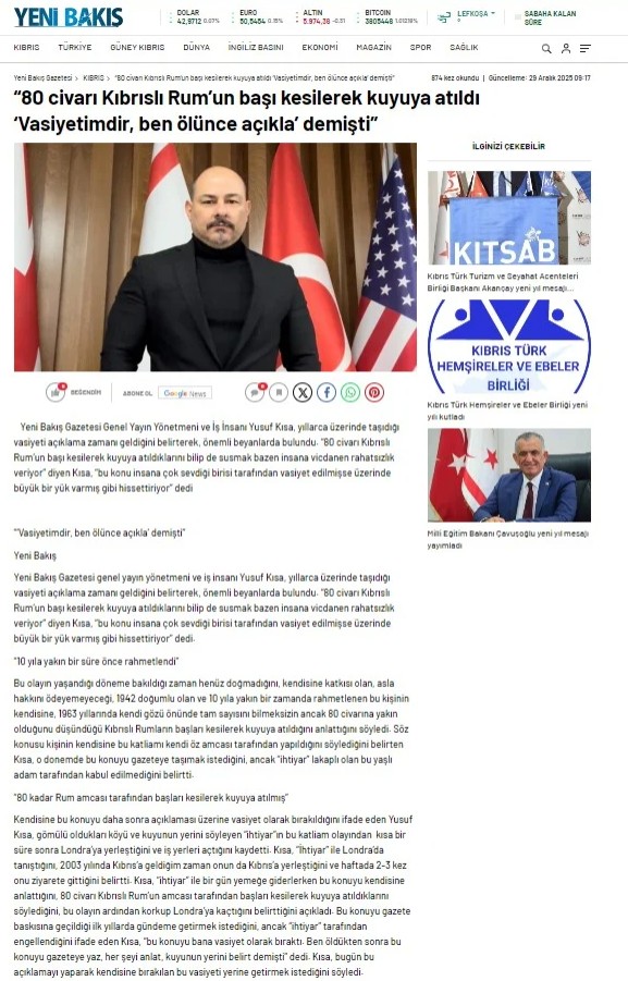 Οι πληροφορίες δημοσιεύονται σήμερα Τετάρτη (31/12) στην τουρκοκυπριακή εφημερίδα «Αβρούπα», του Σενέρ Λεβέντ. Το δημοσίευμα με τίτλο «80 περίπου Ελληνοκύπριοι αποκεφαλίστηκαν και ρίχθηκαν σε πηγάδι», αναφέρεται σε δηλώσεις του Τουρκοκύπριου επιχειρηματία και αρχισυντάκτη της εφημερίδας YENİ BAKİŞ, Yusuf Kısa, o οποίος σημείωσε ότι, άτομο το οποίο φώναζαν «Γέρο» έδωσε την μαρτυρία. Ο «Γέρος», ο οποίος γεννήθηκε το 1942 και απεβίωσε πριν από 10 σχεδόν χρόνια, διέμενε στο Λονδίνο. Του είχε αναφέρει στο παρελθόν για μια σφαγή Ελληνοκυπρίων που διαπράχθηκε το 1963, ωστόσο είχε ζητήσει τη μη δημοσιοποίηση του θέματος ενόσω βρισκόταν εν ζωή.