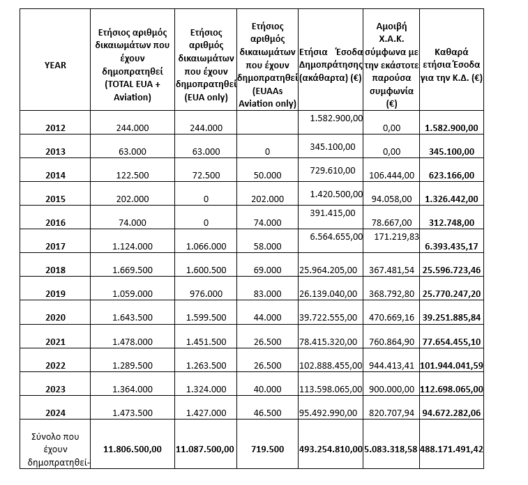 Στον πιο κάτω πίνακα, στην τελευταία στήλη (δεξιά) παρουσιάζονται κατά έτος τα έσοδα της Κυπριακής Δημοκρατίας από τη δημοπράτηση ρύπων: