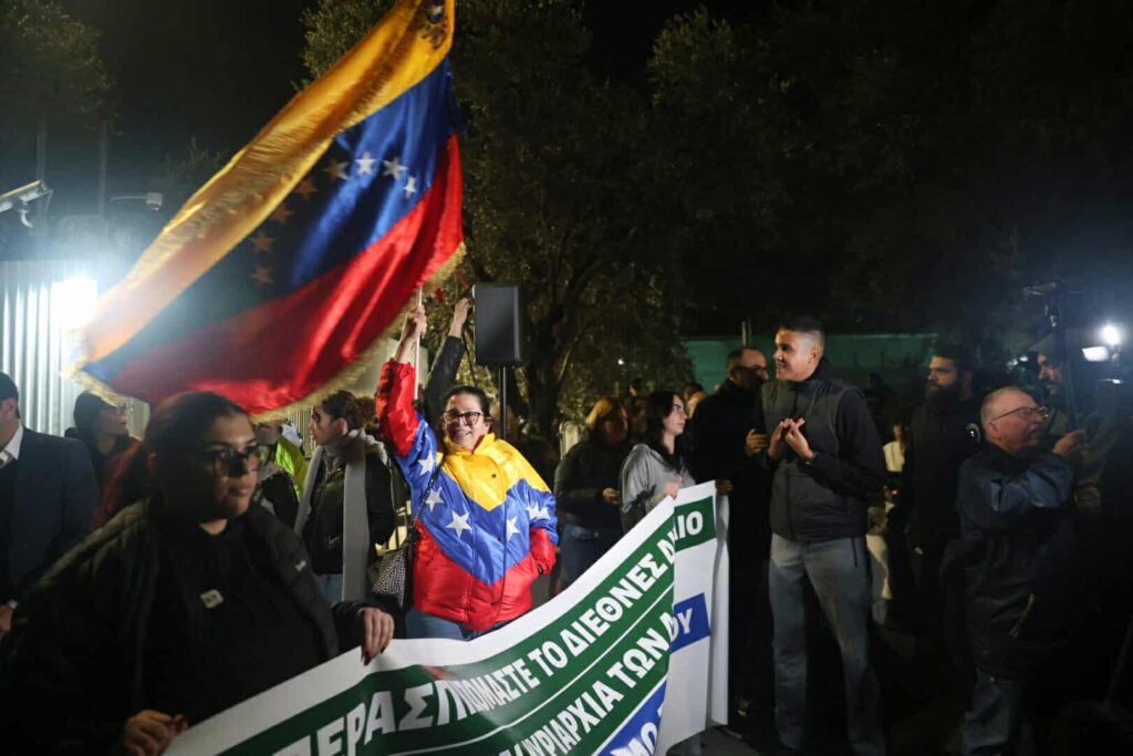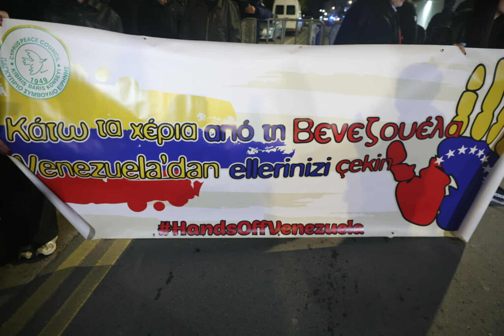 «Κάτω τα χέρια από τη Βενεζουέλα» φώναξαν διαδηλωτές σε διαμαρτυρία που πραγματοποιήθηκε νωρίτερα, κάτω από δρακόντεια μέτρα ασφαλείας, έξω από την Πρεσβεία των ΗΠΑ στη Λευκωσία. Η εκδήλωση, η οποία έγινε με σκοπό να εκφραστεί αλληλεγγύη προ τον λαό της Βενεζουέλας, διοργανώθηκε από το Παγκύπριο Συμβούλιο Ειρήνης, με τη συμμετοχή του ΑΚΕΛ, της Κομμουνιστικής Πρωτοβουλίας Κύπρου και της ΠΕΟ.