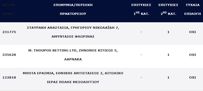 Στην κλήρωση βρέθηκαν τρία τυχερά δελτία στη 2η κατηγορία, τα οποία κερδίζουν το ποσό των €100.000 για κάθε επιτυχία.