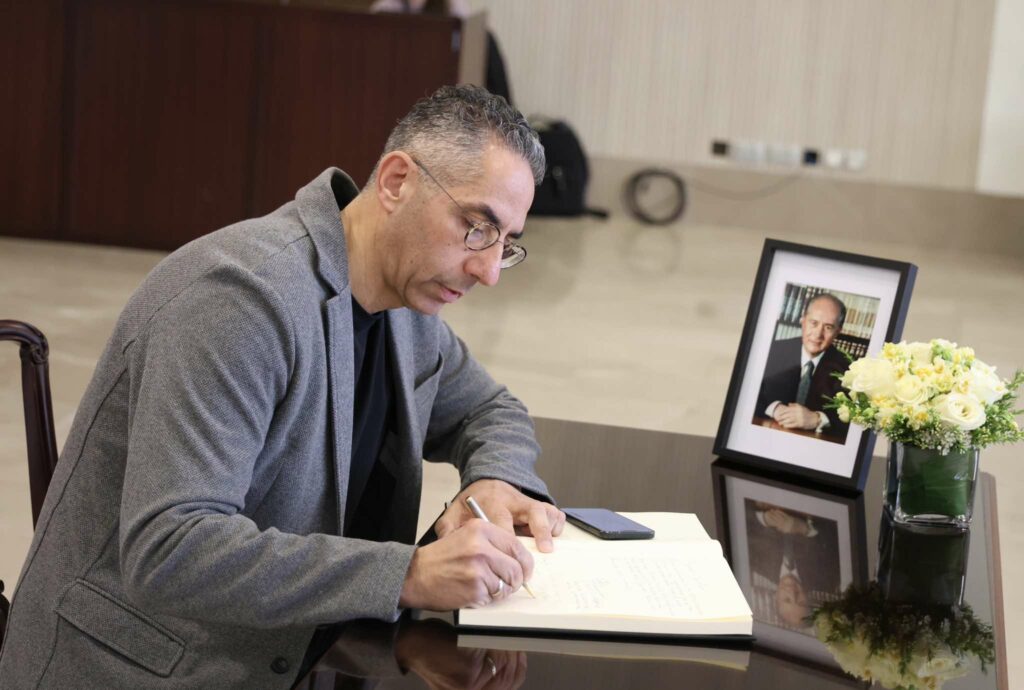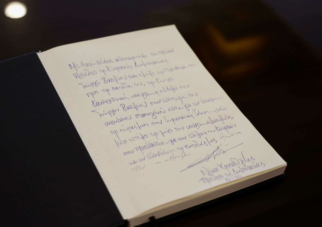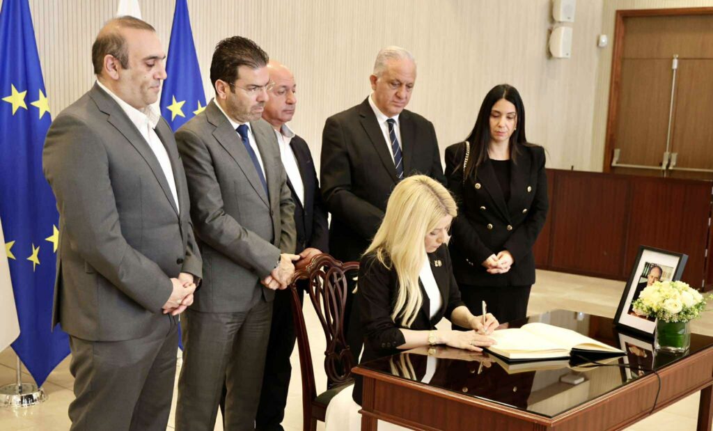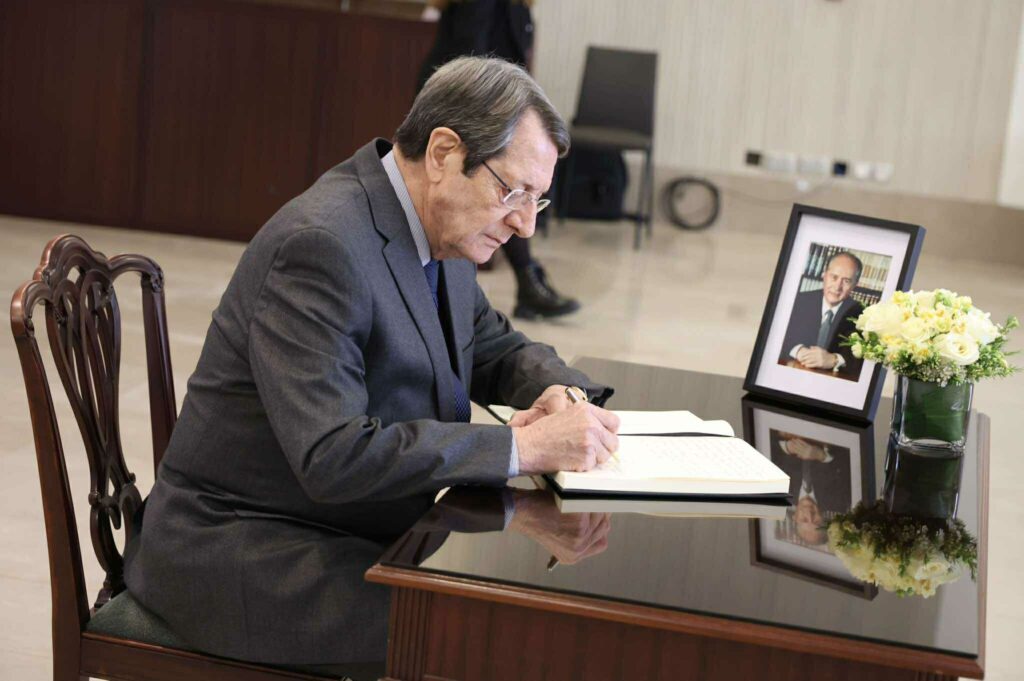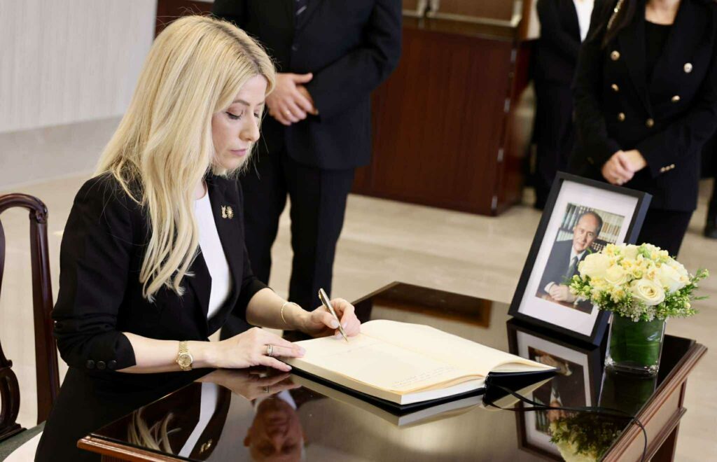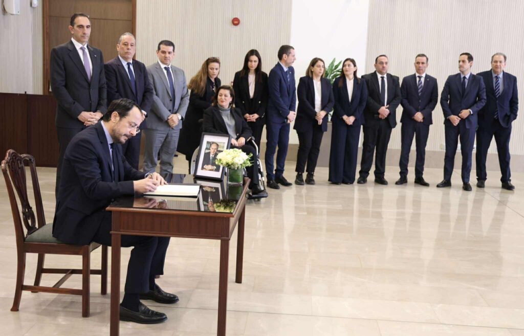 Με ζωγραφισμένη τη θλίψη για την απώλεια του οραματιστή πρώην Προέδρου, ο οποίος έφυγε από τη ζωή στην αγκαλιά της οικογένειάς του σε ηλικία 94 ετών, ο Πρόεδρος Χριστοδουλίδης πλησίασε το βιβλίο και το υπέγραψε.